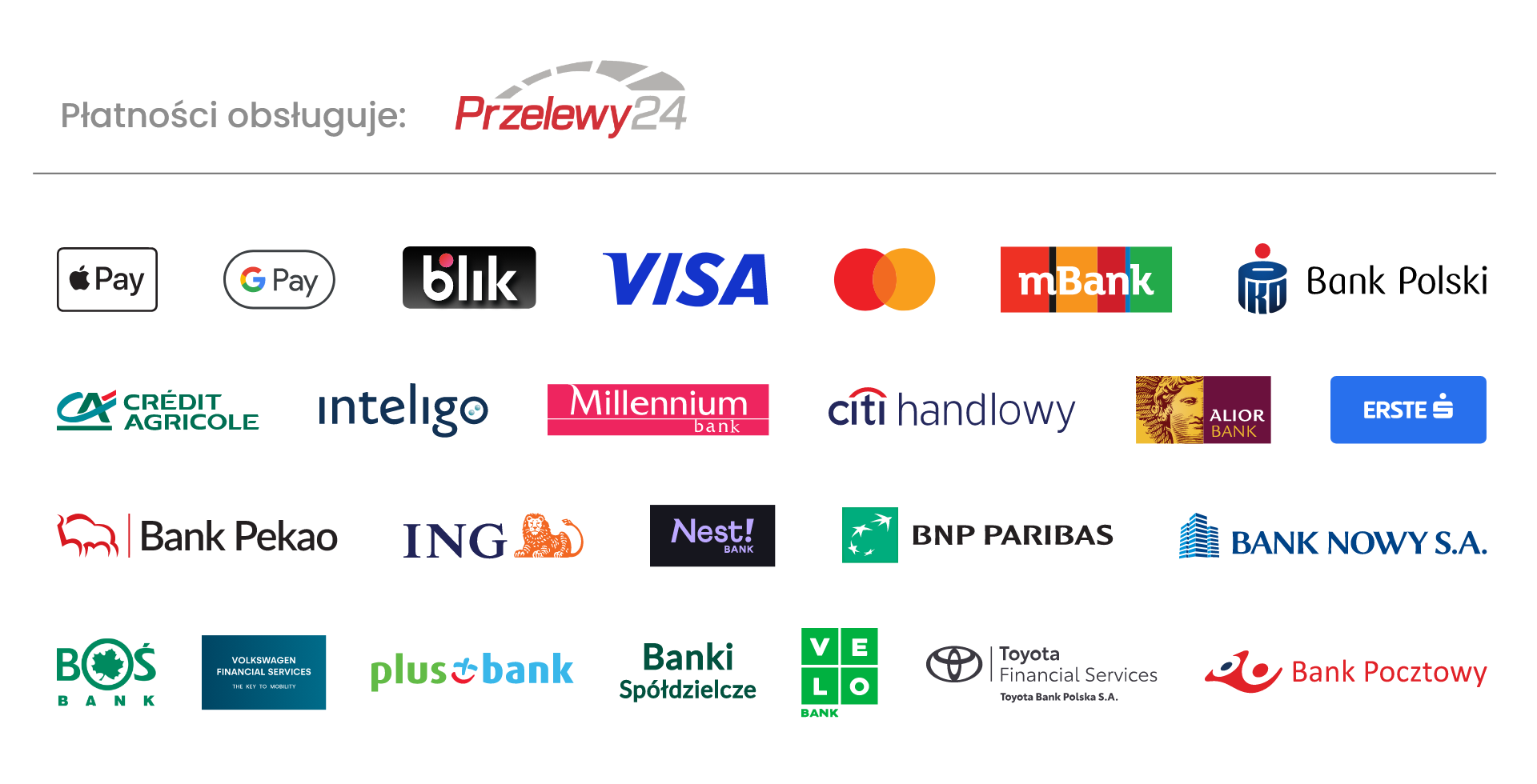 - BLIK, Visa, Mastercard, Apple Pay, Google Pay, PayPo, przelewy online