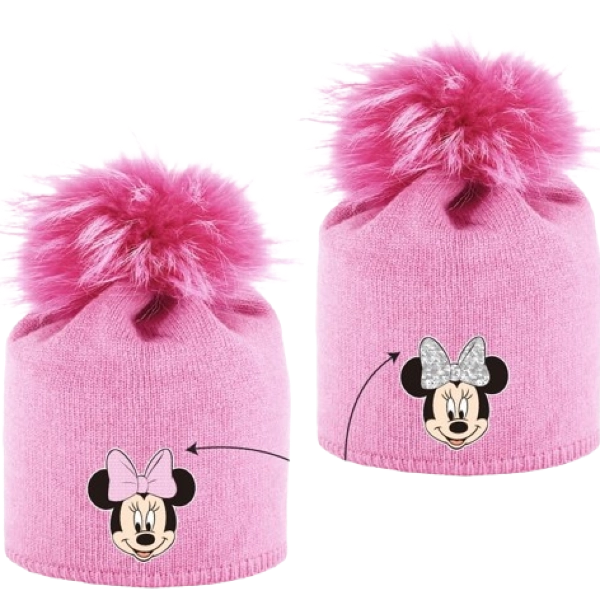 - Zimowa czapka dziecięca z wizerunkiem Myszki Minnie z cekinową kokardą.