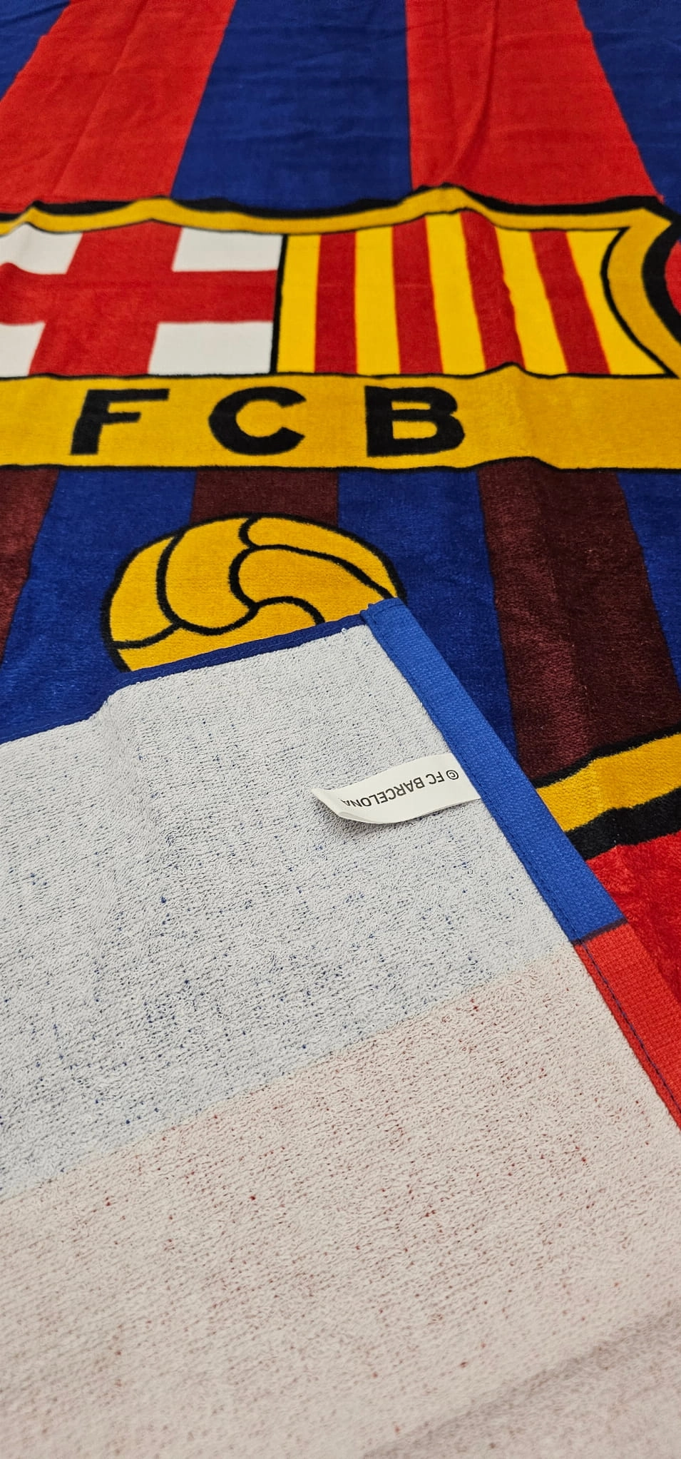 Ręcznik posiada oficjalny motyw klubowy FC Barcelona, co czyni go atrakcyjnym gadżetem dla fanów piłki nożnej.