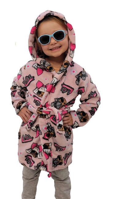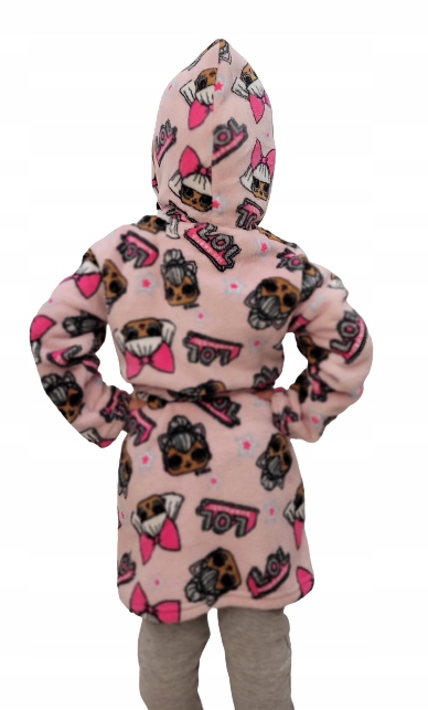 - Rózowy, ciepły szlafrok dziecięcy z kapturem, wiązany w pasie, w powtarzający się wizerunek LOL ,