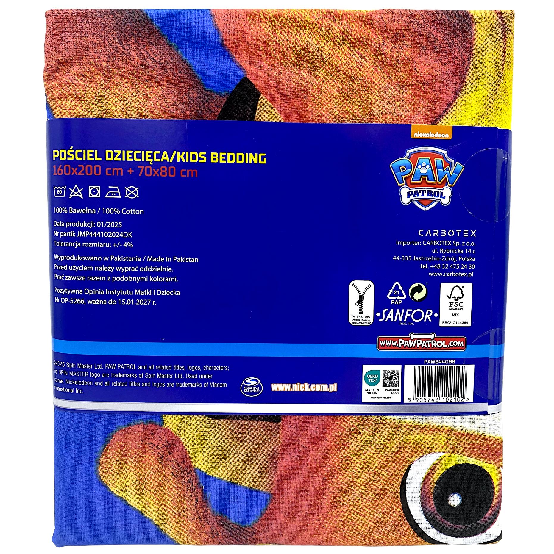 Wykonana w 100% z wysokiej jakości bawełny, pościel dla dziecka Psi Patrol 160x200 jest miękka, oddychająca i bezpieczna dla skóry. Naturalny materiał zapewnia komfortowy sen oraz dobrą cyrkulację powietrza, dzięki czemu dziecko nie przegrzewa się w nocy . Trwały nadruk i intensywne kolory zachowują swoją jakość nawet po wielu praniach, a praktyczne zapięcie na zamek ułatwia codzienne użytkowanie .